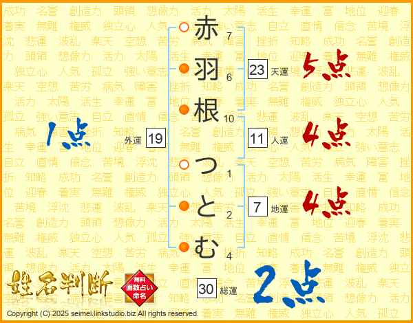 赤(7画)羽(6画)根(10画) つ(1画)と(2画)む(4画)