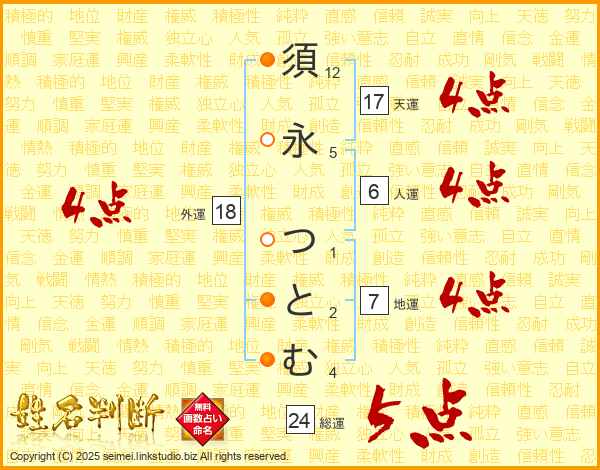須(12画)永(5画) つ(1画)と(2画)む(4画)