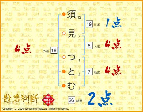 あなたの人生を表す1番重要な運勢です。生涯を通じて影響する総合運となり、主に50歳以降の晩年期に影響を及ぼします。苗字と名前の合計画数。