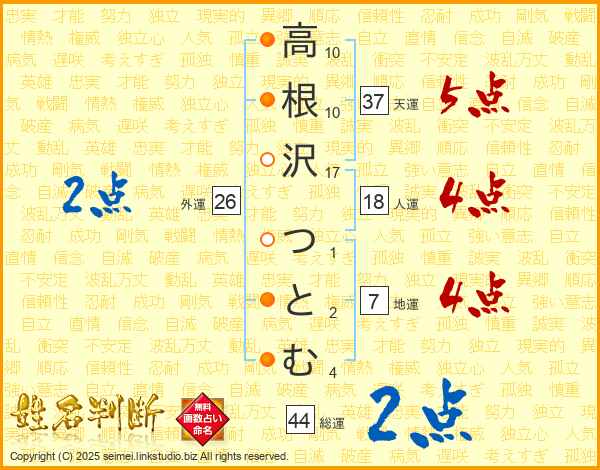 あなたの人生を表す1番重要な運勢です。生涯を通じて影響する総合運となり、主に50歳以降の晩年期に影響を及ぼします。苗字と名前の合計画数。