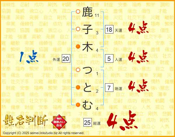 鹿(11画)子(3画)木(4画) つ(1画)と(2画)む(4画)