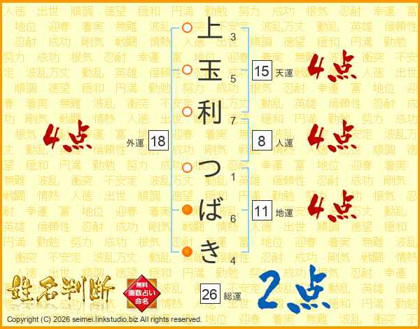 上(3画)玉(5画)利(7画) つ(1画)ば(6画)き(4画)