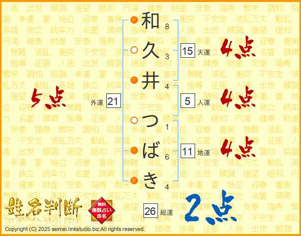 生活面を象徴する運勢です。外部から受ける影響力を表し、結婚運、家庭運や職場、環境への順応性を表します。総運から人運を引いた画数。姓や名が1文字の場合を除く。