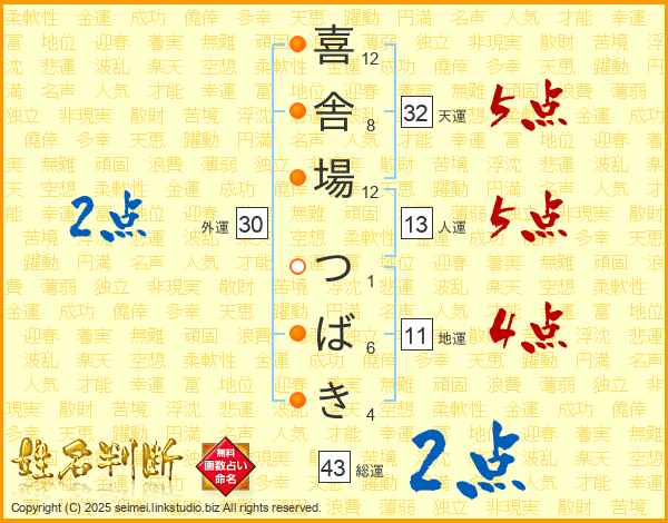 喜(12画)舎(8画)場(12画) つ(1画)ば(6画)き(4画)