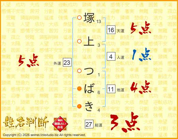 塚上つばきさんの天運は16画の5点!