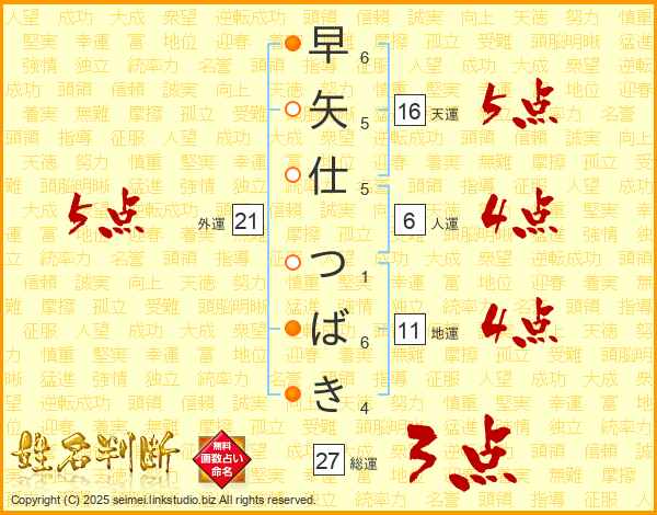 早(6画)矢(5画)仕(5画)  つ(1画)ば(6画)き(4画)