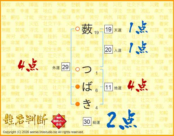 生活面を象徴する運勢です。外部から受ける影響力を表し、結婚運、家庭運や職場、環境への順応性を表します。総運から人運を引いた画数。姓や名が1文字の場合を除く。