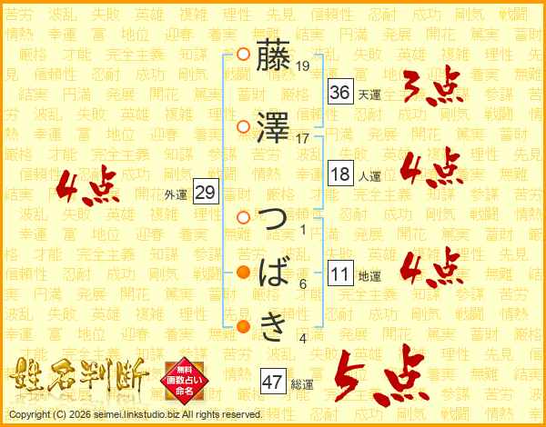 藤(19画)澤(17画) つ(1画)ば(6画)き(4画)