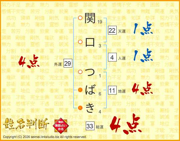 関口つばきさんの総運は33画の4点!