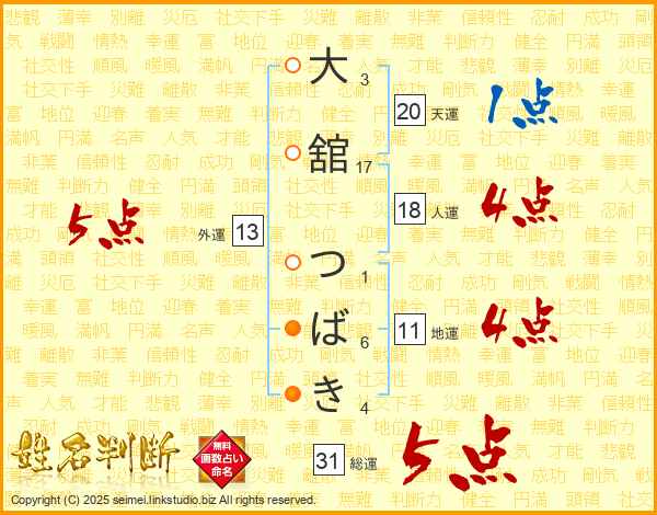 生活面を象徴する運勢です。外部から受ける影響力を表し、結婚運、家庭運や職場、環境への順応性を表します。総運から人運を引いた画数。姓や名が1文字の場合を除く。