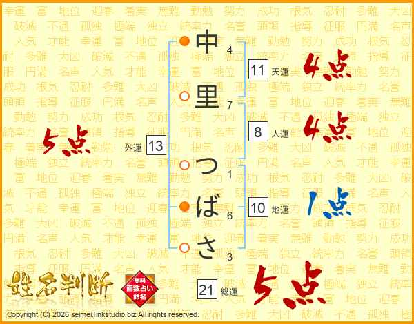 中里つばささんの総運は21画の5点!