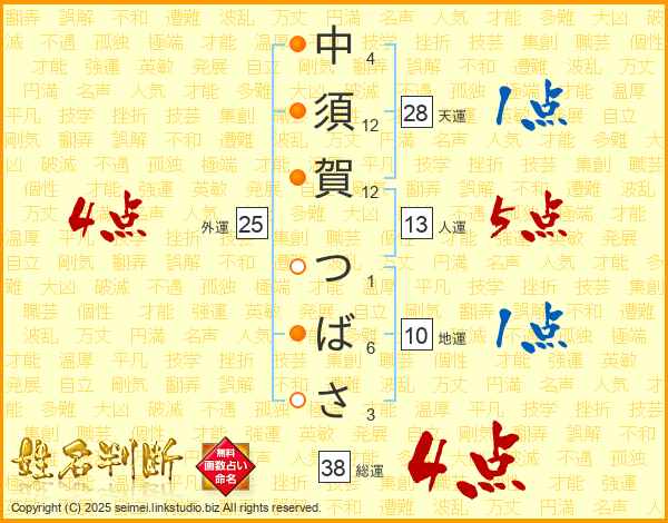中(4画)須(12画)賀(12画) つ(1画)ば(6画)さ(3画)