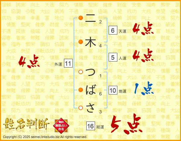 二(2画)木(4画) つ(1画)ば(6画)さ(3画)