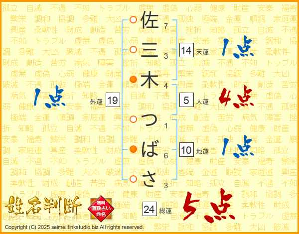 佐(7画)三(3画)木(4画) つ(1画)ば(6画)さ(3画)