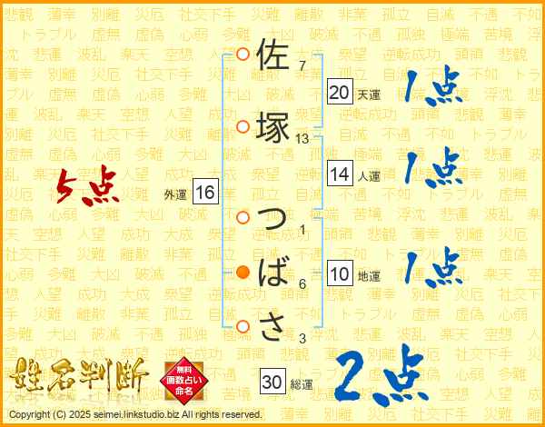 佐(7画)塚(13画) つ(1画)ば(6画)さ(3画)