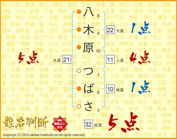 生活面を象徴する運勢です。外部から受ける影響力を表し、結婚運、家庭運や職場、環境への順応性を表します。総運から人運を引いた画数。姓や名が1文字の場合を除く。