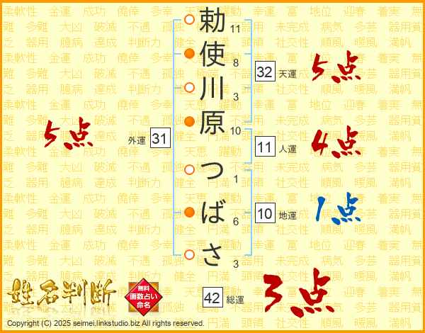 生活面を象徴する運勢です。外部から受ける影響力を表し、結婚運、家庭運や職場、環境への順応性を表します。総運から人運を引いた画数。姓や名が1文字の場合を除く。