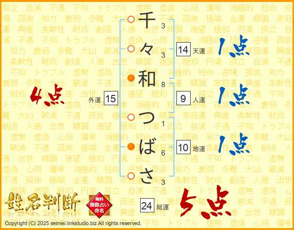 生活面を象徴する運勢です。外部から受ける影響力を表し、結婚運、家庭運や職場、環境への順応性を表します。総運から人運を引いた画数。姓や名が1文字の場合を除く。