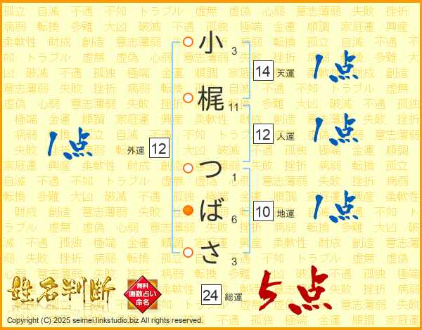 小(3画)梶(11画) つ(1画)ば(6画)さ(3画)