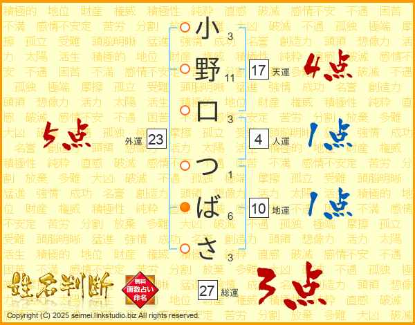 小野口つばささんの総運は27画の3点!
