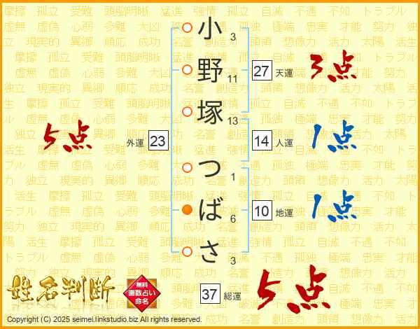 小(3画)野(11画)塚(13画) つ(1画)ば(6画)さ(3画)