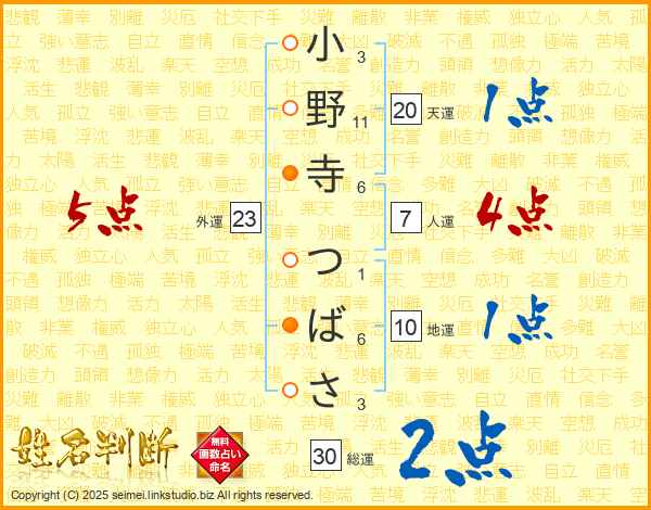 生活面を象徴する運勢です。外部から受ける影響力を表し、結婚運、家庭運や職場、環境への順応性を表します。総運から人運を引いた画数。姓や名が1文字の場合を除く。