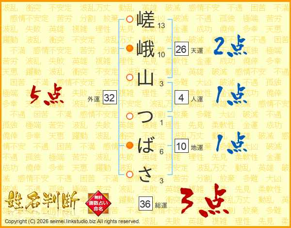 生活面を象徴する運勢です。外部から受ける影響力を表し、結婚運、家庭運や職場、環境への順応性を表します。総運から人運を引いた画数。姓や名が1文字の場合を除く。