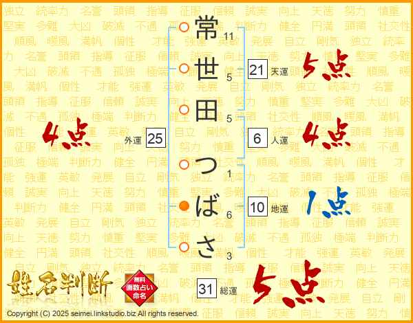 常世田つばささんの天運は21画の5点!