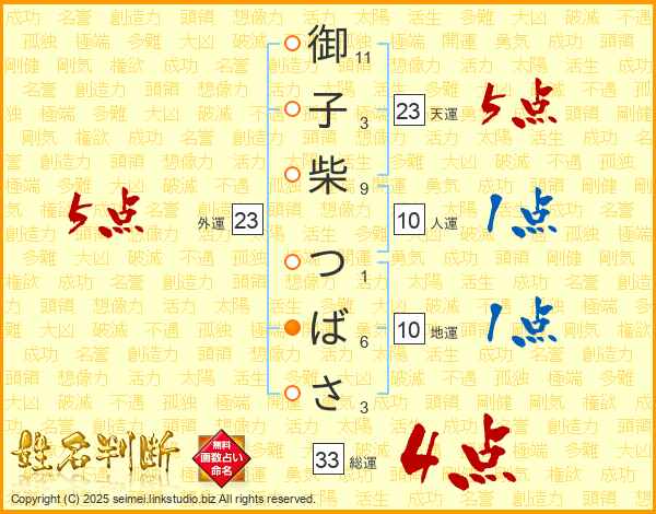生活面を象徴する運勢です。外部から受ける影響力を表し、結婚運、家庭運や職場、環境への順応性を表します。総運から人運を引いた画数。姓や名が1文字の場合を除く。