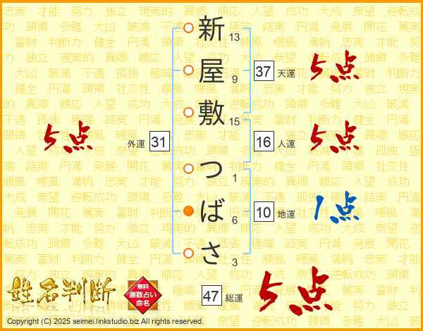 新(13画)屋(9画)敷(15画) つ(1画)ば(6画)さ(3画)