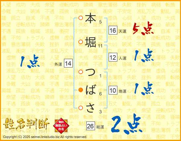 生活面を象徴する運勢です。外部から受ける影響力を表し、結婚運、家庭運や職場、環境への順応性を表します。総運から人運を引いた画数。姓や名が1文字の場合を除く。