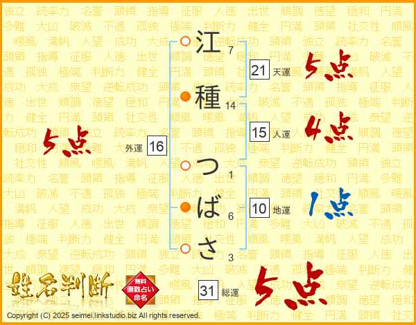 生活面を象徴する運勢です。外部から受ける影響力を表し、結婚運、家庭運や職場、環境への順応性を表します。総運から人運を引いた画数。姓や名が1文字の場合を除く。