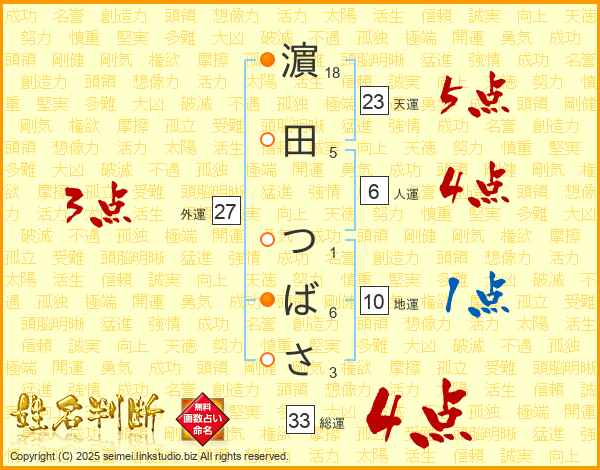 生活面を象徴する運勢です。外部から受ける影響力を表し、結婚運、家庭運や職場、環境への順応性を表します。総運から人運を引いた画数。姓や名が1文字の場合を除く。