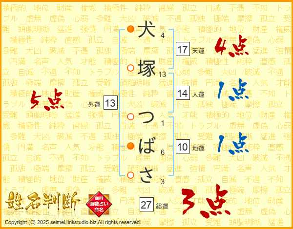 犬(4画)塚(13画) つ(1画)ば(6画)さ(3画)