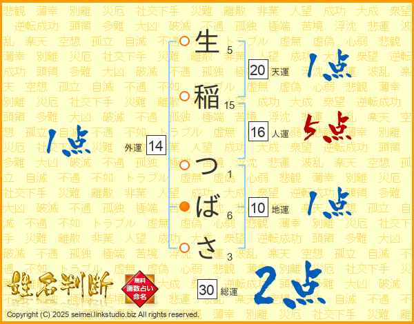 生(5画)稲(15画)  つ(1画)ば(6画)さ(3画)