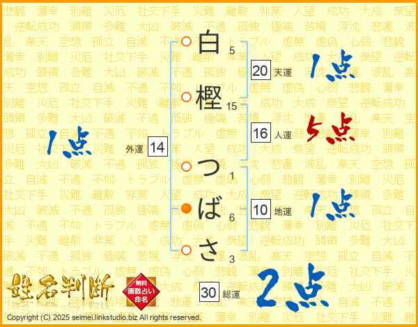 白(5画)樫(15画) つ(1画)ば(6画)さ(3画)