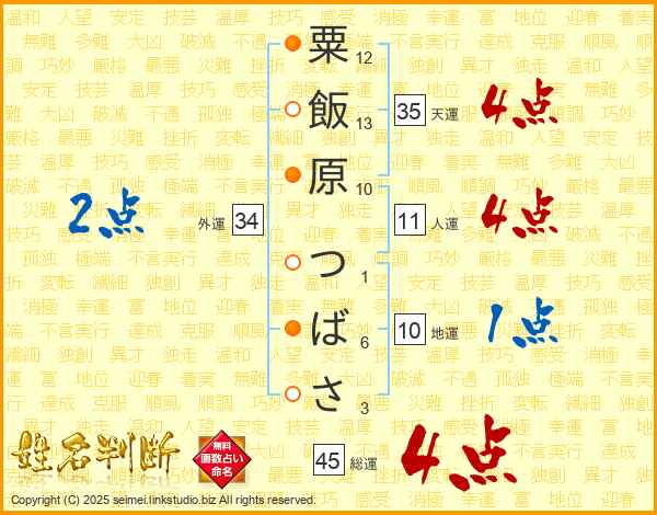 粟飯原つばささんの総運は45画の4点!