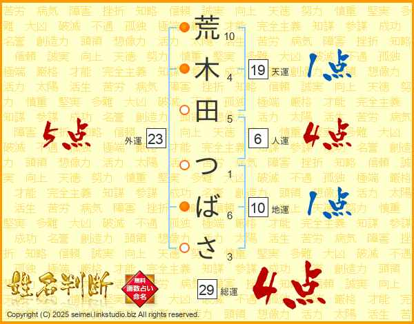 荒木田つばささんの総運は29画の4点!