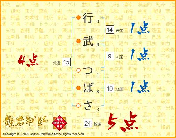 行(6画)武(8画) つ(1画)ば(6画)さ(3画)