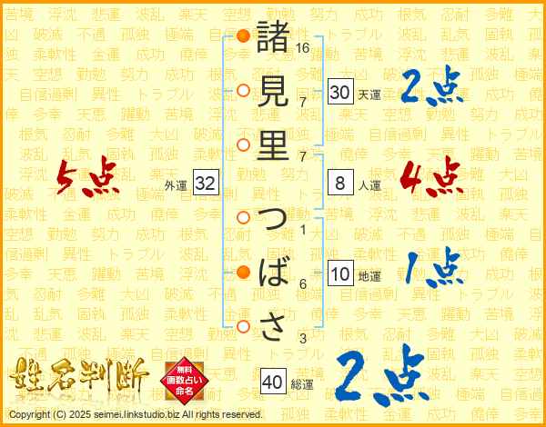 生活面を象徴する運勢です。外部から受ける影響力を表し、結婚運、家庭運や職場、環境への順応性を表します。総運から人運を引いた画数。姓や名が1文字の場合を除く。