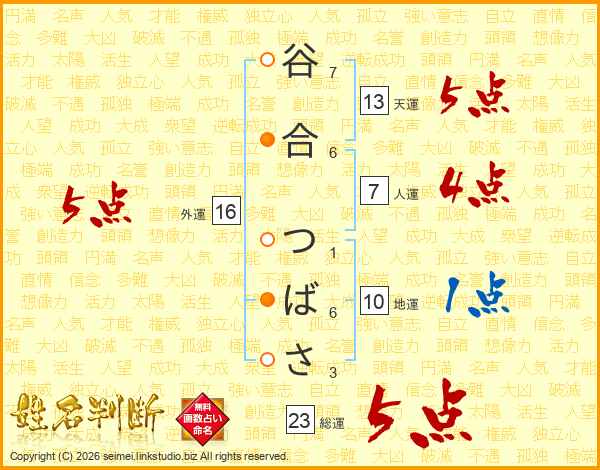 谷(7画)合(6画) つ(1画)ば(6画)さ(3画)