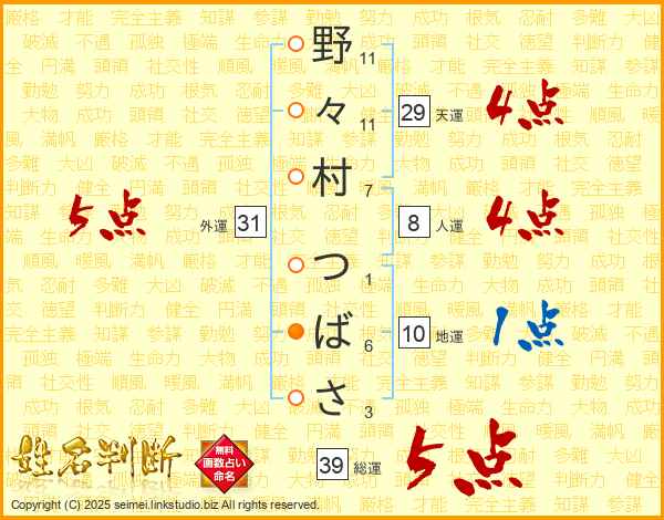 あなたの人生を表す1番重要な運勢です。生涯を通じて影響する総合運となり、主に50歳以降の晩年期に影響を及ぼします。苗字と名前の合計画数。