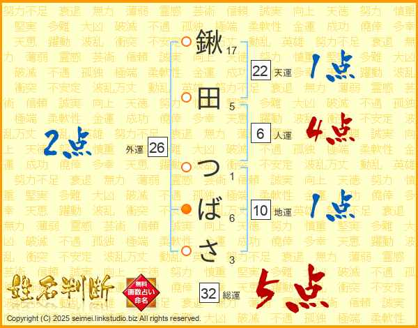 生活面を象徴する運勢です。外部から受ける影響力を表し、結婚運、家庭運や職場、環境への順応性を表します。総運から人運を引いた画数。姓や名が1文字の場合を除く。