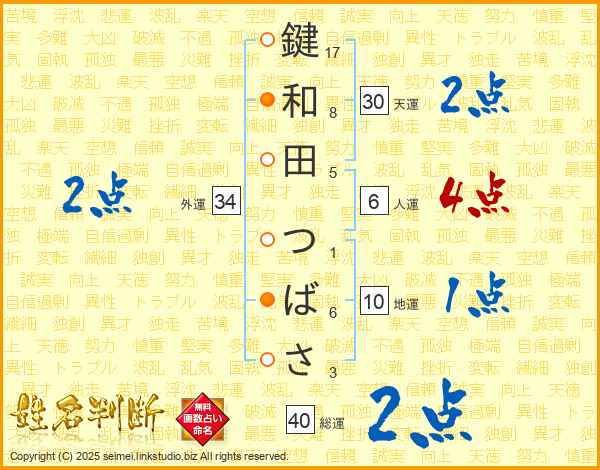 生活面を象徴する運勢です。外部から受ける影響力を表し、結婚運、家庭運や職場、環境への順応性を表します。総運から人運を引いた画数。姓や名が1文字の場合を除く。