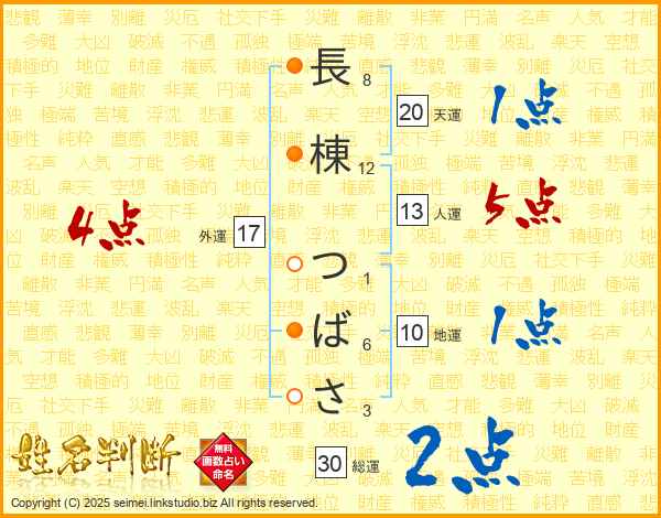 生活面を象徴する運勢です。外部から受ける影響力を表し、結婚運、家庭運や職場、環境への順応性を表します。総運から人運を引いた画数。姓や名が1文字の場合を除く。