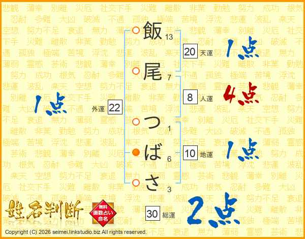 飯(13画)尾(7画) つ(1画)ば(6画)さ(3画)