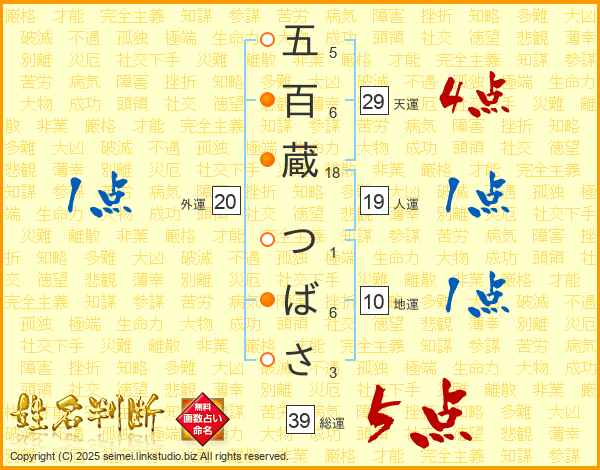 五百蔵つばささんの総運は39画の5点!