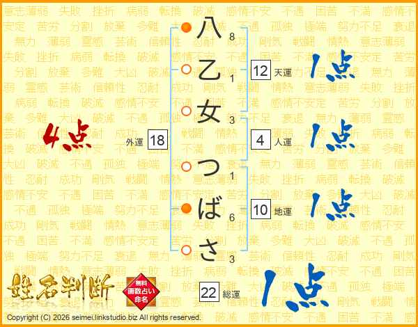 八(8画)乙(1画)女(3画) つ(1画)ば(6画)さ(3画)