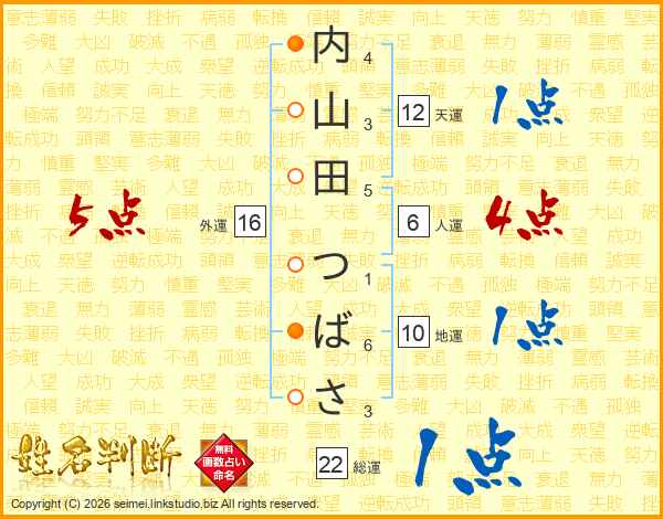 生活面を象徴する運勢です。外部から受ける影響力を表し、結婚運、家庭運や職場、環境への順応性を表します。総運から人運を引いた画数。姓や名が1文字の場合を除く。