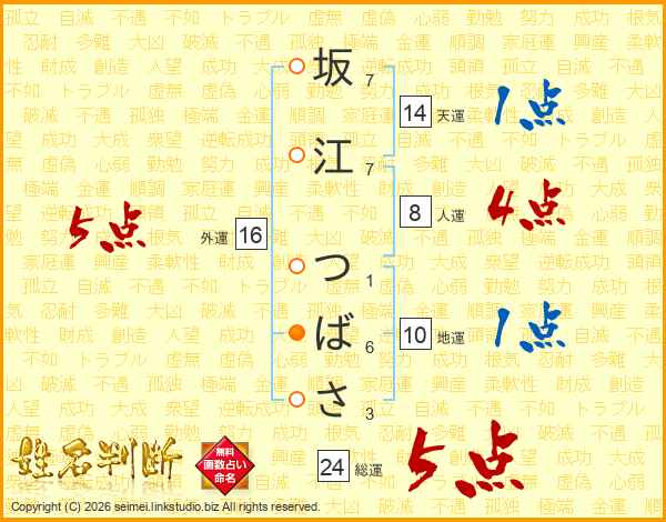 坂江つばささんの総運は24画の5点!